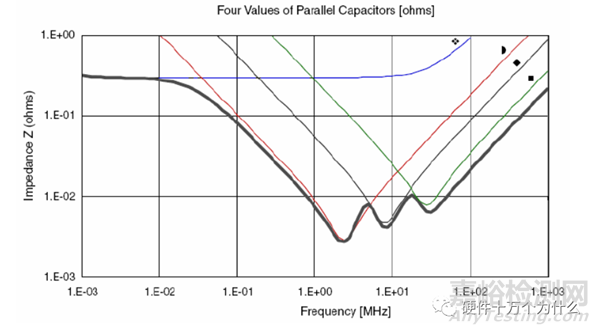 不同電容并聯(lián),其阻抗曲線底部要比單個電容要平坦的多(雖然存在一個反諧振點,有個阻抗尖峰),因而更能有效的在很寬的頻率范圍內(nèi)減小阻抗。