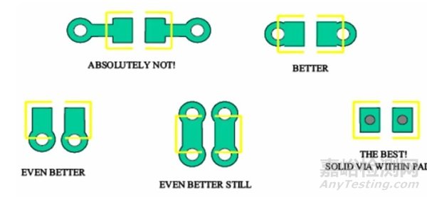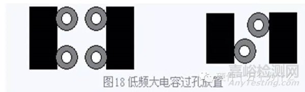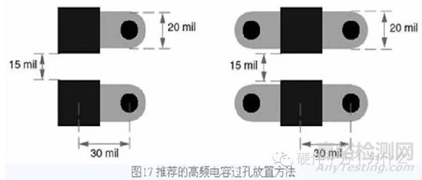 對于大尺寸的電容,比如板級濾波所用的鉭電容,推薦用圖18中的安裝方法。注意:小尺寸電容禁止在兩個焊盤間打孔,因為容易引起短 路。