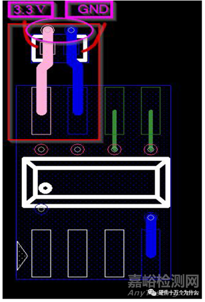 在安裝電容時,要從焊盤拉出一小段引出線,然后通過過孔和電源平面連接,接地端也是同樣。放置過孔的基本原則就是讓這一環(huán)路面積最小,進(jìn)而使總的寄 生電感最小。
