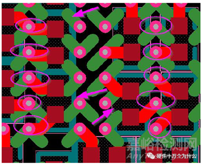 需要強(qiáng)調(diào)一點:有些工程師為了節(jié)省空間,有時讓多個電容使用公共過孔。任何情況下都不要這樣做。最好去想辦法優(yōu)化電容組合的設(shè)計,減少電容數(shù)量。由于印制線越寬,電感越小,從焊盤到過孔的引出線盡量加寬,如果可能,盡量和焊盤寬度相同。這樣即使是0402封裝的電容,你也可以使用20mil 寬的引出線。