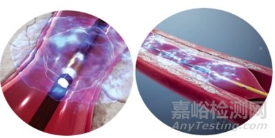 電能被輸送到脈沖發(fā)射器,球囊內50%生理鹽水和50%造影劑的電解質混合溶液瞬間氣化,產生的氣泡迅速膨脹然后塌陷,從而在血管內產生了相當于50atm的聲壓力沖擊波。聲壓力沖擊波僅作用于鈣等高密度組織,但不影響正常軟組織,不破壞內膜內彈力層,可以保持內膜的完整性,從而恢復血管順應性。