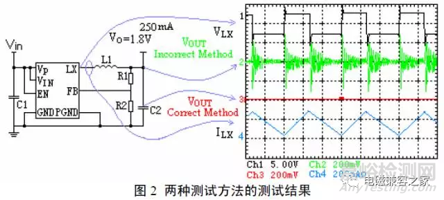 圖2為兩種不同測(cè)試方法得到的輸出電壓曲線。降壓型變換電路工作在1.5MHz,輸出電壓1.8V,負(fù)載電流250mA??梢宰⒁獾骄G色曲線(2)為在每一個(gè)開(kāi)關(guān)時(shí)刻出現(xiàn)的高頻噪聲。而紅色的曲線(3)為沒(méi)有獲取噪聲。因此,結(jié)構(gòu)和方法對(duì)準(zhǔn)確測(cè)量是很重要的。