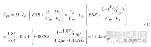 圖3(圖3在下面)為輸入電容器的紋波電壓和電流的波形,公式1則描述了電壓紋波的鋸齒特性。紋波的大小隨輸入電壓波動(dòng),在占空比為50%時(shí)最大。為減少輸入紋波,要么增加電容量,要么減少輸入電容CIN的等效串聯(lián)電阻(ESR)。陶瓷電容器通常具有非常低的ESR,但對(duì)輸入電壓紋波影響不大。一個(gè)0805封裝10μF 10V X5R電容器在直流3.6V應(yīng)用中,實(shí)際容量約為4.2μF。對(duì)于1.8V 400mA的輸出負(fù)載,輸入波紋電壓的峰值為17.4mV(見(jiàn)公式1)。