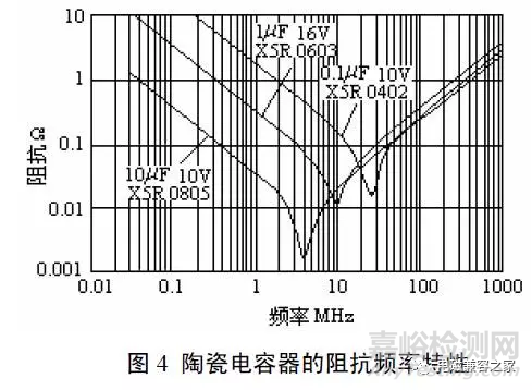 在便攜式應(yīng)用中,直流變換器的高頻輸入噪聲通??蛇_(dá)100MHz以上。“噪聲”其實(shí)是一個(gè)甚高頻振鈴或變換器電源部分的寄生振蕩。在開(kāi)關(guān)轉(zhuǎn)換過(guò)程中,能量?jī)?chǔ)存在感性和容性的寄生振蕩中直到消失。在每個(gè)周期內(nèi),噪聲都會(huì)出現(xiàn)在開(kāi)關(guān)波形的邊緣,盡管噪聲頻率非常高,但僅用一個(gè)典型的旁路電容器是不能使其衰減的。陶瓷電容器的阻抗頻率特性曲線,如圖4所示。當(dāng)在100MHz或以上時(shí),不論電容器值的大小,阻抗都呈感性并且很相似。因此,在Buck電路的輸入電容上并聯(lián)一個(gè)較小值的陶瓷電容器并不能有效地減少這種高頻噪聲。