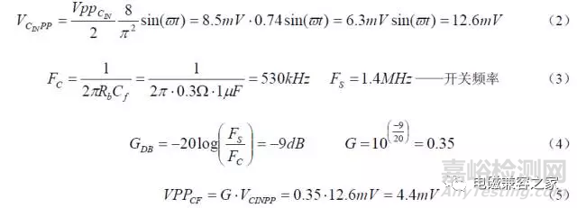 如果電路板走線的阻抗不足以作為阻性元件構(gòu)成低通濾波器,可用一個(gè)小鐵氧體磁珠來(lái)增加阻抗,改善對(duì)噪聲的抑制。使用鐵氧體磁珠可以把輸入紋波衰減近似為鋸齒波,并可把它降低為基頻成分。利用鐵氧體磁珠的直流阻抗(Rb)和濾波電容 (Cf)可以確定轉(zhuǎn)折頻率和在相應(yīng)開(kāi)關(guān)頻率下的紋波衰減。鐵氧體磁珠抑制紋波的典型電路(如圖5)及相應(yīng)的計(jì)算方法如下: