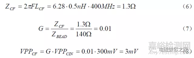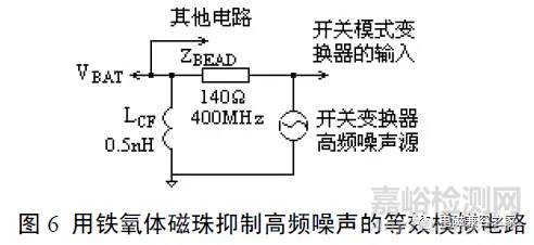 高頻噪聲的衰減要求測(cè)試在輸入高頻噪聲的共振頻率下鐵氧體磁珠的阻抗。通常高頻噪聲出現(xiàn)在約400MHz時(shí),而圖7中在400MHz下鐵氧體磁珠的阻抗約140Ω。從圖4可知,濾波電容器在400MHz時(shí)相應(yīng)的阻抗約為1Ω并且呈感性。這樣,利用該網(wǎng)絡(luò)就可以大概計(jì)算出在400MHz時(shí)的衰減,等效模擬電路如圖6所示。