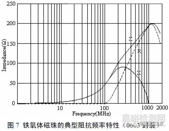 圖7為一個(gè)貼片封裝的鐵氧體磁珠的典型阻抗頻率特性。鐵氧體磁珠有一個(gè)很小的直流阻抗,使它通過(guò)直流電流對(duì)系統(tǒng)的效率有很小的影響。它還在變換器出現(xiàn)高頻噪聲的頻帶內(nèi)擁有很大的阻抗。從曲線中可以看出,頻率在200MHz以上時(shí)阻抗大于100Ω。在應(yīng)用了鐵氧體磁珠的例子中,有500mA的額定電流和0.3Ω的直流阻抗,這就使附加器件的損耗可以降到最低。