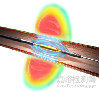 紅色圓圈表示組織中的超聲能量在動(dòng)脈內(nèi)傳遞能量時(shí)產(chǎn)生的熱量,形成360°消融。藍(lán)色圓圈表示動(dòng)脈內(nèi)循環(huán)水的主動(dòng)冷卻,以保護(hù)動(dòng)脈免受熱損傷。