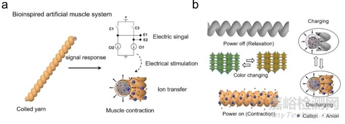 自然界中的許多生物,包括章魚、墨魚、安第斯雨蛙等,它們不僅能像變色龍一樣快速適應(yīng)周圍環(huán)境的顏色,而且能可逆地改變自身的紋理或姿勢以適應(yīng)環(huán)境,從而表現(xiàn)出更加復(fù)雜的姿態(tài)、偽裝能力。人造肌肉被認(rèn)為是這些生物體能夠?qū)崿F(xiàn)其紋理或姿勢可逆變化的方式之一,可以模仿生命系統(tǒng)的復(fù)雜運(yùn)動,與真實(shí)肌肉相比提供更高的輸出能量。然而,電化學(xué)離子注入驅(qū)動的人造肌肉存在致動特性單一、難以在空氣中穩(wěn)定運(yùn)行的問題,阻礙了其未來發(fā)展。受人體肌肉的運(yùn)動機(jī)理啟發(fā)(圖1),東華大學(xué)王宏志課題組基于前期在氧化鎢納米線(W18O49 NWs)、氧化釩納米線(V2O5 NWs)電致變色致動器上的工作積累。選用碳管紗線(CNTF)作為導(dǎo)電核層材料,具有較高長徑比的V2O5 NWs作為鞘層活性材料,構(gòu)筑V2O5 NWs/CNTF核鞘結(jié)構(gòu)多功能紗線。利用濕法纏繞、濕法加捻,構(gòu)筑得到具有致動變色雙響應(yīng)的多功能纖維(圖2a-b)。+4 V電壓驅(qū)動下,螺旋結(jié)構(gòu)電致變色人工肌肉纖維最大收縮幅度可達(dá)到17.9%,顏色可以在黃色-黃綠色-藍(lán)灰色之間可逆轉(zhuǎn)變,反射率對比度高達(dá)53.9%,顯示出良好的致動和變色性能(圖2b,人工肌肉變色驅(qū)動機(jī)理)。