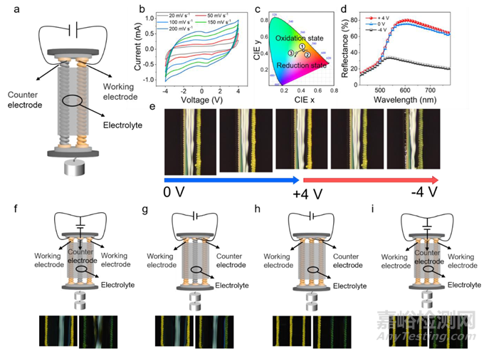 為了構(gòu)筑可以在空氣中穩(wěn)定運(yùn)行的電致變色人工肌肉(EAM),創(chuàng)新性地提出了熱澆筑快速冷卻的電解質(zhì)成型方法(圖3a),在特定電壓刺激下,EAM可以在空氣中穩(wěn)定運(yùn)行,并發(fā)生較大的收縮變形(收縮形變12%)和可逆的顏色變化(反射率對比度變化為50.1%)。此外,進(jìn)行器件結(jié)構(gòu)的可編程設(shè)計,獲得了具有不同顏色組合的EAM(圖3f-i,圖4)。