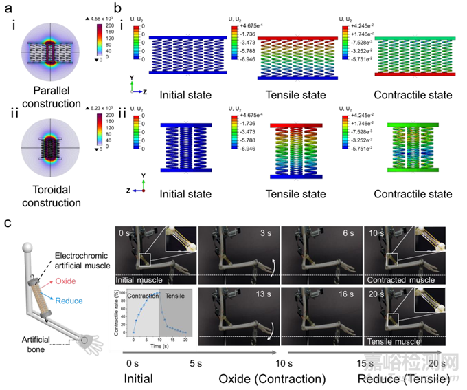 圖5. 不同排布方式的電致變色人工肌肉的力學(xué)電學(xué)模擬;環(huán)形排布的電致變色人工肌肉被應(yīng)用于人工假肢外骨骼的性能表征及演示實(shí)驗(yàn)。