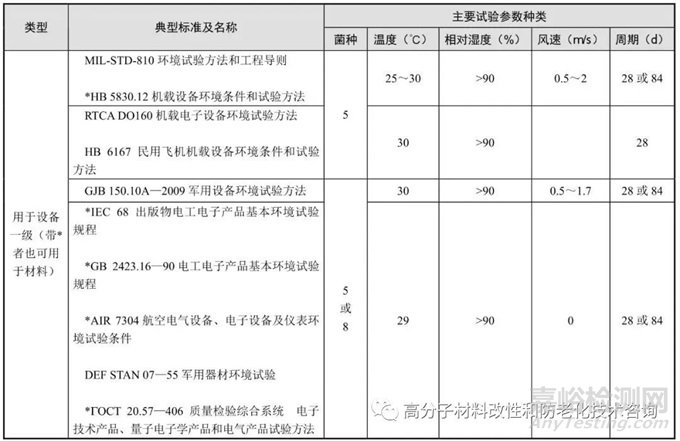 目前,許多國(guó)家都制定了霉菌試驗(yàn)標(biāo)準(zhǔn)。這些標(biāo)準(zhǔn)基本上分為 3 個(gè)類型,第一類是明確只用于設(shè)備一級(jí)的標(biāo)準(zhǔn),第二類是明確只用于材料一級(jí)的標(biāo)準(zhǔn),第三類是設(shè)備和材料混用的標(biāo)準(zhǔn),具體如表1所示。