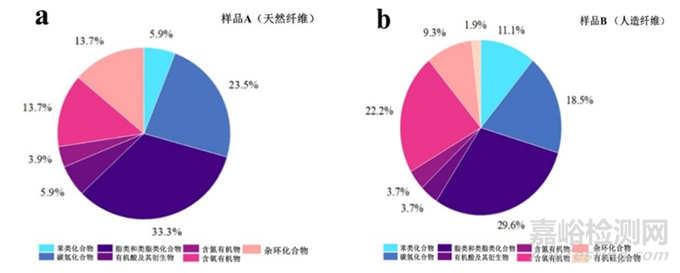▲圖1 樣品A(a圖)和樣品B(b圖)檢出的所有化學物質類別及所占比例