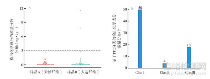 使用Toxtree3.1工具對檢出的化學物質進行基于毒性學關注閾值 (Threshold of toxicological concern,TTC)法則的Cramer分級,對檢出化學成分的風險性進行初步研究,結果見表1,其分布情況見圖2b。