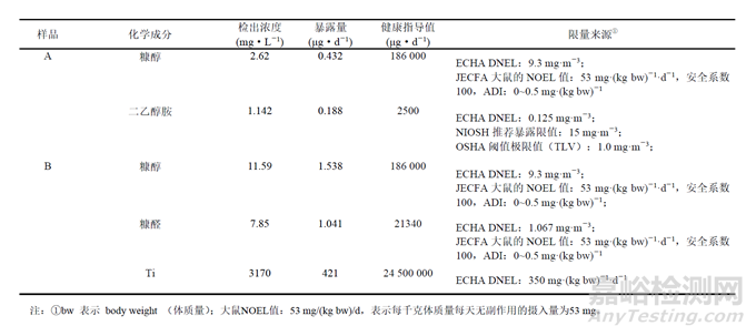 對暴露量最高的糠醇、糠醛、二乙醇胺和Ti 4種化學成分進行風險評估,結果表明其暴露值均遠低于健康指導值,僅為其四十萬分之一到萬分之一之間。