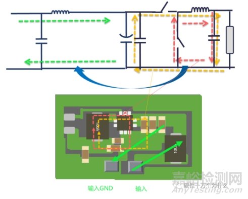 如圖14.36,為一個BUCK電路的LED驅(qū)動板,從原理圖來看,綠色的濾波器輸入地和黃色的功率地通過輸入電容隔開,這樣高頻電流環(huán)路的噪聲電流會先經(jīng)過輸入的陶瓷電容,但是實際的PCB布局中,可以看到輸入地和高頻電流環(huán)路重合,噪聲可以直接耦合到輸入環(huán)路上。