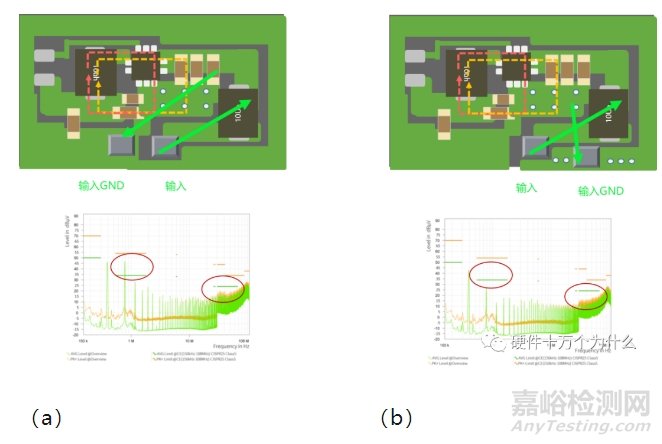 我們實際測得結(jié)果如圖14.37(a),二次諧波的幅值比一次諧波還要高很多,并超過了限值。為了解決這個耦合問題,我們需要調(diào)整輸入地的位置,原將輸入地和功率地斷開,移到右側(cè),通過過孔和輸入陶瓷電容連接??梢钥吹?,如圖14.37(b),二次諧波的分量下降了將近20dB。