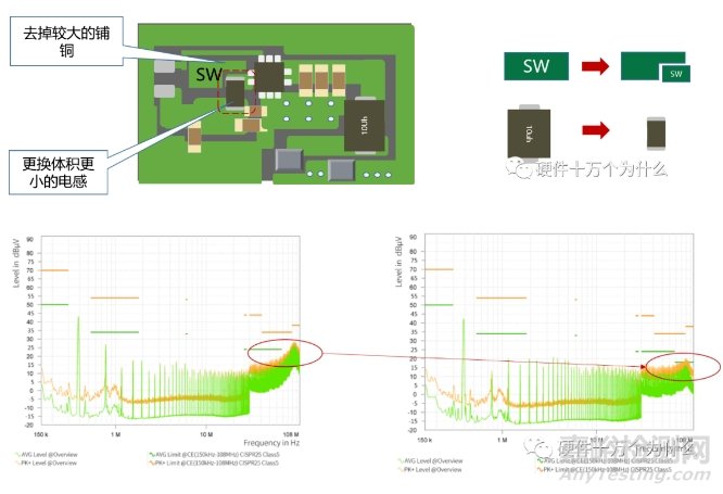 按照前面的分析思路,可以通過減小SW面積和電感體積進行噪聲源的抑制。10μH的電感以及SW鋪銅面積都比較大,在保證電流能力的情況下,切掉部分SW面積,換用更小體積的小感值電感。最終結(jié)果如圖14.38所示,優(yōu)化SW面積和電感后,提升了10dB左右,基本滿足了class 5的限值要求。