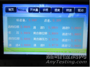 CS106試驗過程中,AMT控制器由直流24V供電,處于上電狀態(tài),連接測試工裝,在模擬量界面設(shè)定檔位及參數(shù)。觀察測試工裝的模擬量界面,各項參數(shù)均應(yīng)始終保持在標(biāo)準(zhǔn)值的誤差范圍內(nèi),如圖3所示。