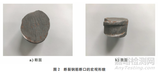 將鋼筋斷口清洗后,對其進行宏觀觀察,結(jié)果如圖2所示。由圖2可知:鋼筋斷口為典型的I型裂紋斷口,斷裂起源于表面螺紋根部,裂紋沿螺紋根部的內(nèi)擴展,斷面大部分較光滑,未見頸縮現(xiàn)象,屬于典型的脆性斷裂。