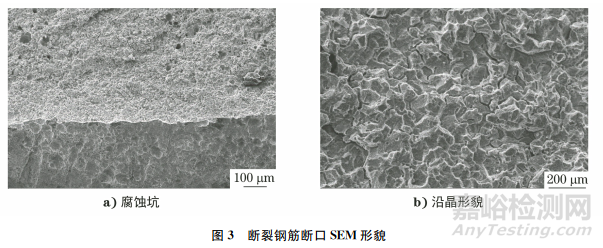 使用掃描電鏡對鋼筋斷口進行觀察,結(jié)果如圖3所示。由圖3可知:斷裂源區(qū)主要呈沿晶特征,擴展區(qū)呈解理和準(zhǔn)解理特征,斷裂源區(qū)鋼筋表面局部存在腐蝕坑。
