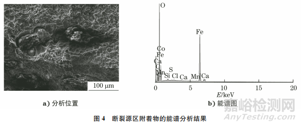 對斷裂源區(qū)附著物進行能譜分析,結(jié)果如圖4所示。由圖4可知:附著物主要含有Fe元素和O元素,還存在少量S元素和Cl元素,為腐蝕產(chǎn)物。