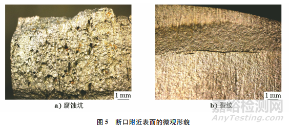 在鋼筋斷口附近取樣,使用鹽酸水溶液對試樣表面進行除銹處理,然后用體視顯微鏡對試樣表面進行微觀觀察,結(jié)果如圖5所示。由圖5可知:斷裂源區(qū)附近表面存在腐蝕坑,非斷裂源區(qū)鋼筋表面無明顯腐蝕坑;斷裂源區(qū)附近螺紋根部存在裂紋。