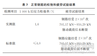 在斷裂鋼筋上取樣,對試樣進行拉伸試驗,結(jié)果如表2所示。取與斷裂鋼筋同批次的正常鋼筋進行松弛和疲勞試驗,結(jié)果如表3所示。由表2,3可知:該批次鋼筋的力學(xué)性能符合 GB/T 20065—2016的要求。