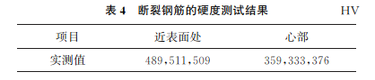 采用顯微硬度計對斷裂鋼筋的近表面處和心部進行硬度測試,試驗力為4.90N,試驗力保持時間為10s,測試結(jié)果如表4所示。由表4可知:鋼筋近表面處的硬度遠(yuǎn)高于心部的硬度。