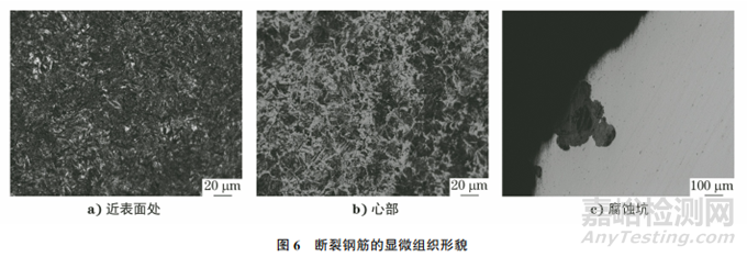 在鋼筋斷口附近取樣,將試樣腐蝕后置于光學(xué)顯微鏡下觀察,結(jié)果如圖6所示。由圖6可知:試樣近表面處組織為回火馬氏體,心部組織為珠光體+貝氏體+少量鐵素體;斷裂源區(qū)附近縱截面可觀察到腐蝕坑,部分深度達(dá)到0.31mm。