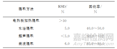 試驗(yàn)對(duì)比了超聲提取、電熱板加熱提取 、微波提取和水浴提取等4種提取方法的效果,每種提取方法均制備7個(gè)平行樣品,并進(jìn)行了加標(biāo)回收試驗(yàn),加標(biāo)量為0.5mg·kg-1。在4種提取方法下,鉛的測(cè)定值的相對(duì)標(biāo)準(zhǔn)偏差(RSD)和回收率見(jiàn)表1。
