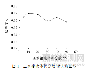 為了考察王水溶液的體積分?jǐn)?shù)對(duì)石墨中鉛超聲提取率的影響,選取了體積分?jǐn)?shù)分別為5%,10%,20%,30%,40%,50%的王水溶液作為提取劑,上機(jī)測(cè)定后繪制王水溶液體積分?jǐn)?shù)-吸光度曲線,結(jié)果見(jiàn)圖1。