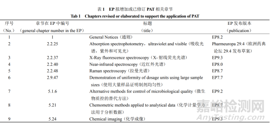 2018 年 1 月,EDQM 又在歐洲藥典論壇上發(fā)布了 PAT 草案(5.25. Process analytical technology),計(jì)劃將其收入 EP。該草案對 PAT 的定義、測量方式以及數(shù)據(jù)的分析方法等進(jìn)行了簡單介紹。為了推動(dòng)和支持 PAT 技 術(shù)的應(yīng)用,EDQM 還新增或修訂了 EP 中 PAT 相關(guān)的 9 個(gè)章節(jié)(見表 1),主要涉及 PAT 的常用技術(shù)與數(shù)據(jù)分析方法。