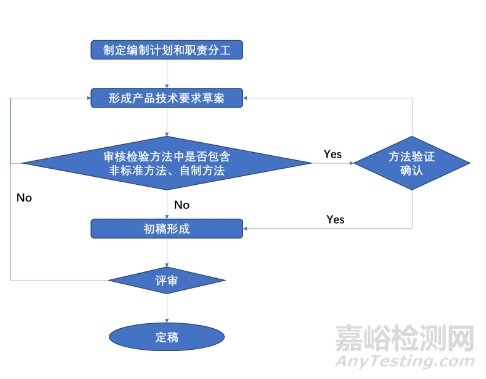 產(chǎn)品技術(shù)要求編制是一項嚴謹?shù)墓ぷ?,切勿生搬硬套,張冠李戴。編制需要以臨床應(yīng)用為基礎(chǔ),以技術(shù)水平及市場定位為導(dǎo)向,以大量的實驗技術(shù)、生產(chǎn)實踐經(jīng)驗、檢測手段和大量的調(diào)查研究數(shù)據(jù)為依據(jù)。因此需要注冊人多部門結(jié)合,共同完成產(chǎn)品技術(shù)要求的輸出。如研發(fā)部輸出性能參數(shù)與方法,市場部負責(zé)把控市場導(dǎo)向,質(zhì)量部參與驗證,形成總稿,經(jīng)評審后輸出。下圖提供編制產(chǎn)品技術(shù)要求的一般流程,以供參考。
