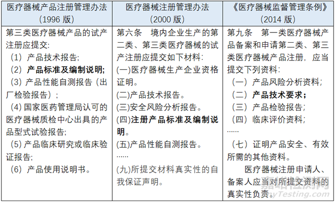 回溯自1996年首次發(fā)布醫(yī)療器械產(chǎn)品注冊管理辦法以來的法規(guī),產(chǎn)品技術(shù)要求的演變經(jīng)歷了產(chǎn)品標準→注冊產(chǎn)品標準→產(chǎn)品技術(shù)要求三個階段。相關(guān)文件摘要如下表: