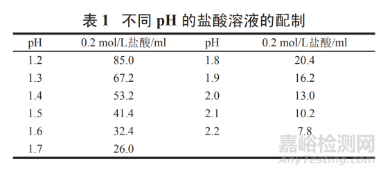 精密量取濃鹽酸 9.0 ml,加水稀釋至 1 000 ml,搖勻,即得 pH 1.0 的鹽酸溶液。其他 pH 鹽酸溶液:按表 1 量取 0.2 mol/L 鹽酸 ( 精密量取濃鹽酸 18.0 ml,加水稀釋至 1 000 ml,搖勻,即得 ) 適量,加水稀釋至 200 ml,搖勻,即得 pH 1.2~2.2 鹽酸溶液。
