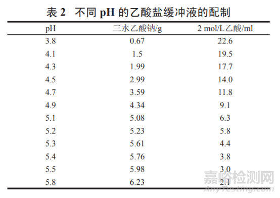 按表 2 取三水乙酸鈉和 2 mol/L 乙酸 ( 取冰乙酸 120.0 g,加水稀釋 至 1 000 ml,搖勻,即得 ) 適量,加水溶解并稀釋至 1 000 ml,搖勻,即得。