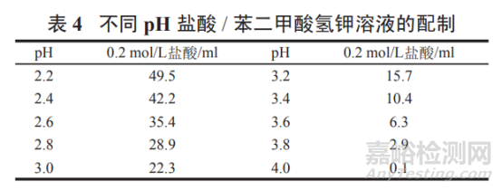 取苯二甲酸氫鉀 2.04 g,按表 4 加入 0.2 mol/L 鹽酸適量, 加水溶解并稀釋至 200 ml,搖勻,即得。