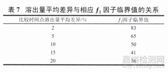表 7 為溶出量平均差異與相應(yīng) ƒ2 因子臨界值的關(guān)系。