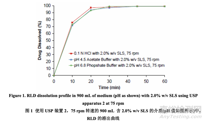 對(duì)于像acetriptan的生物藥學(xué)分類系統(tǒng)(BCS) II類化合物的吸收,由于其低溶解度,藥物釋放通常是速率限制過(guò)程。因此,應(yīng)徹底評(píng)估 RLD 片劑的溶出。開始,使用該產(chǎn)品在 FDA 溶出方法數(shù)據(jù)庫(kù)中推薦的溶出方法(用 USP 裝置 2(槳法),轉(zhuǎn)速為 75 rpm,900 mL 含 2.0% w/v 十二烷基硫酸鈉(SLS) 的 0.1 N HCl 溶出介質(zhì))。溶出介質(zhì)的溫度維持在 37 ± 0.5 °C,用 UV 分光光度法在 282 nm 波長(zhǎng)處測(cè)定藥物濃度。也得到了在含 2.0% w/v SLS 的不同 pH 值 (pH 4.5 醋酸緩沖液和 pH 6.8 磷酸緩沖液)溶出介質(zhì)的 RLD 片劑的藥物釋放。如圖 1 所示,使用 FDA 推薦的方法,RLD 片劑顯示出快速溶出,對(duì)介質(zhì) pH 值不敏感。