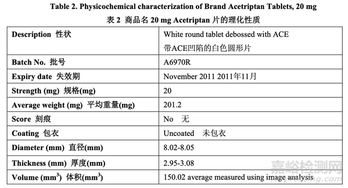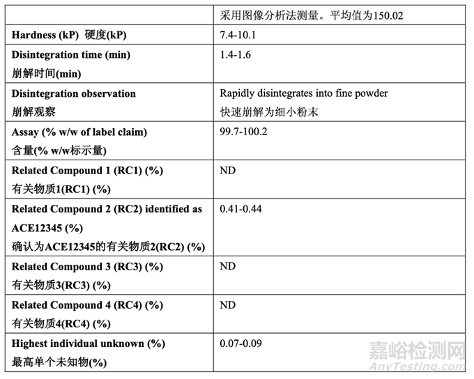 RLD 片的理化性質(zhì)概述在表 2 中。性質(zhì)包括了測(cè)定 ACE12345,一種已知降解物,在臨失效 產(chǎn)品中的濃度。