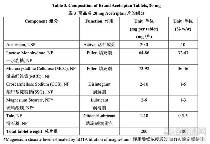 基于 RLD 標(biāo)簽,專利文獻(xiàn)和反向工程,表 3 列出了商品名 20 mg Acetriptan 片的組分。每個(gè)輔料提供的濃度與之前的經(jīng)驗(yàn)一致,低于 FDA 批準(zhǔn)的口服固體制劑非活性成分?jǐn)?shù)據(jù)庫(kù)(IID) 所列出的濃度。