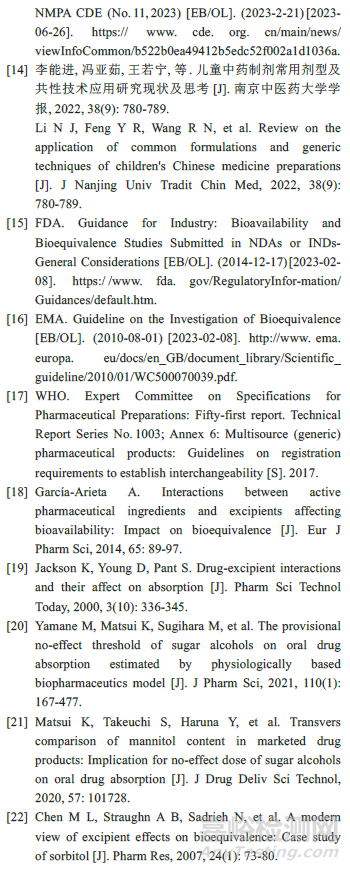 在參考國內(nèi)外相關指導原則的基礎上,還可查閱相關文獻資料對可能影響藥物吸收的輔料用量的合理性進行論證。糖醇類輔料是口服溶液劑中常用的可能影響藥物吸收的輔料之一,已有多篇文獻對該類輔料的用量對藥物生物利用度的影響進行了研究和探討[20-22]。根據(jù)文獻可知,與高滲透性藥物相比,低滲透性藥物的生物利用度受該類輔料的影響更大;且仿制藥與參比制劑中該類輔料用量差異對生物利用度的影響程度還可能受該類輔料含量、藥物的種類和半衰期等多種因素的影響。因此,引用相關文獻時應進行深入透徹的分析,必要時提供相關支持性研究資料。