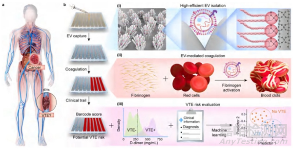 近期,中國科學(xué)院理化技術(shù)研究所研究員王樹濤、孟靖昕團(tuán)隊(duì),聯(lián)合首都醫(yī)科大學(xué)附屬北京友誼醫(yī)院教授張澍田,發(fā)展了一種可檢測血漿EVs凝血風(fēng)險的條形碼(PEVB),為臨床癌癥患者VTE風(fēng)險預(yù)判提供了有效技術(shù)。該技術(shù)具有三個特點(diǎn):利用二氧化鈦納米花快速捕獲血漿樣品的EVs;通過可視化的EVs介導(dǎo)凝血反應(yīng)(陽性條帶數(shù)量)來原位地檢測EVs促凝能力;機(jī)器學(xué)習(xí)輔助的臨床數(shù)據(jù)分析以進(jìn)行準(zhǔn)確的VTE風(fēng)險評估??蒲腥藛T使用PEVB對來自8種癌癥的167名患者進(jìn)行檢測,并采用機(jī)器學(xué)習(xí)將條帶分?jǐn)?shù)與D-二聚體篩查和其他常規(guī)臨床信息整合。該技術(shù)通過篩選合適的機(jī)器學(xué)習(xí)模型,實(shí)現(xiàn)了對VTE的精準(zhǔn)預(yù)測,AUC為0.993,檢測特異性97.1%,靈敏度96.8%,準(zhǔn)確率97.0%,顯著優(yōu)于目前臨床上常用VTE風(fēng)險預(yù)測工具(例如,D-二聚體篩查,特異性44.8%,靈敏度90.3%,準(zhǔn)確率53.2%)。因此,基于條形碼與檢測技術(shù)可直觀、快速、便捷的評估VTE風(fēng)險,在癌癥患者VTE風(fēng)險精準(zhǔn)預(yù)測方面展現(xiàn)出潛力。