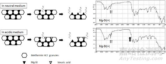 在圖6中,Mg-St(+)片在pH為1.2的介質(zhì)中溶解2min后,在1700 em'左右出現(xiàn)一個特征峰。這個峰可以歸屬為羧基。圖7顯示了硬脂酸和Mg-St的紅外光譜,通過與片劑測量相同的程序獲得。雖然兩個光譜的主要部分是相似的,但在1700 em'左右的峰只觀察到硬脂酸,它可能來自羧酸C=O。此外,將Mg-St分散在pH為1.2和pH為6.8的介質(zhì)表面過夜,獲得Mg-St的紅外光譜(圖7)。結(jié)果表明,只有Mg-St暴露在pH為1.2的介質(zhì)中,在1700 em處出現(xiàn)峰值,表明向硬脂酸轉(zhuǎn)化。該峰與Mg-St(+)片在pH 1.2介質(zhì)中溶出后的峰一致。由此推測,在pH為1.2的介質(zhì)中,片劑表面的Mg-St可能解離成其離子,并發(fā)生氫化反應生成硬脂酸。正如之前的研究所報道的那樣,這種變化是可能發(fā)生的,盡管它們的溶解機制與本研究不同。