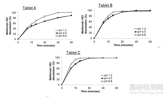 為了研究鹽酸二甲雙胍片的pH依賴性溶出度,我們對三種不同國家銷售的鹽酸二甲雙胍500mg規(guī)格片進行了體外溶出度試驗。溶出試驗是根據(jù)指南中描述的試驗條件進行的,采用100 rpm的籃法溶出裝置,溶出介質(zhì)為不含胃蛋白酶的模擬胃液(SGF, c.a. pH 1.2)、醋酸緩沖液(c.a. pH 4.5)和磷酸鹽緩沖液(c.a. pH 6.8)。得到的溶出結(jié)果如圖2所示:3種片劑的溶出度排序相同(pH 1.2 = pH 4.5 < pH 6.8),溶出現(xiàn)象相同,均為溶蝕性。