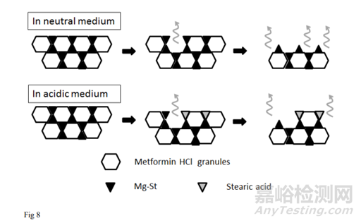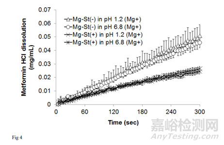 Mg- St的溶出限制了片劑的溶出(Step 2),如添加Mg離子的溶出研究所示。在抑制Mg-St解離和溶出的條件下,Mg-St(+)片的溶出率降低。在中性介質(zhì)中溶解時,延遲機制只能用步驟1和步驟2來解釋。