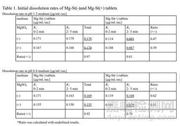 由于片劑中Mg-St的存在導致藥物溶出延遲,提示Mg-St本身的溶出限制了片劑的溶出。Mg-St是一種水溶性較差的化合物,在25℃時,其在水中的溶解度為4mg / 100ml。因此,在片劑表面附近區(qū)域,Mg-St解離成Mg2+離子和硬脂酸離子時,應考慮Mg-St的溶度積。如果溶解介質(zhì)被Mg2+離子飽和,則會抑制Mg-St的解離和溶解。