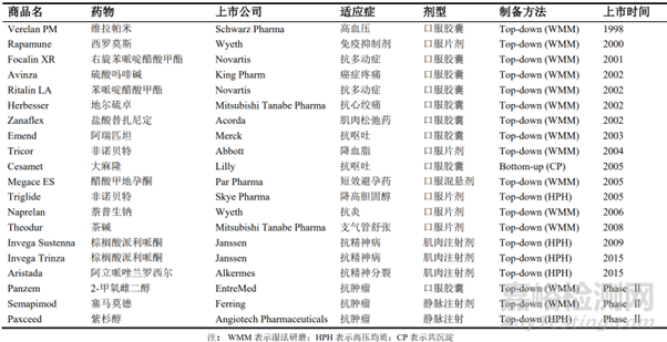 圖1 FDA 批準(zhǔn)上市和部分進(jìn)入臨床研究的納米晶制劑(參考文獻(xiàn)1)