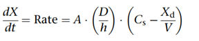 其中dX/dt是溶出速率,A是比表面積,D是擴(kuò)散系數(shù),h是與溶解藥物擴(kuò)散層厚度,Cs是藥物平衡溶解度,Xd是溶解固體的量,V是溶出介質(zhì)的體積。